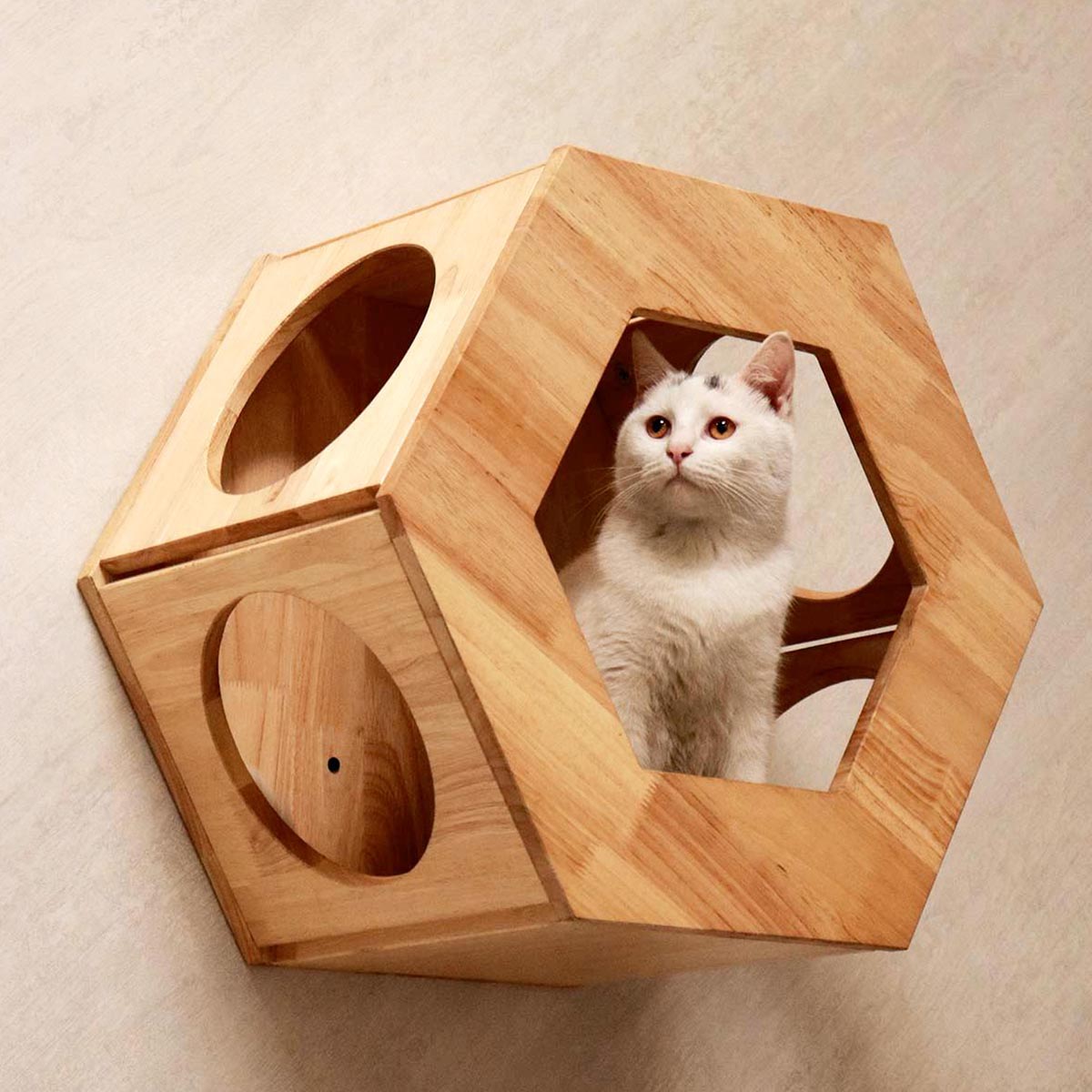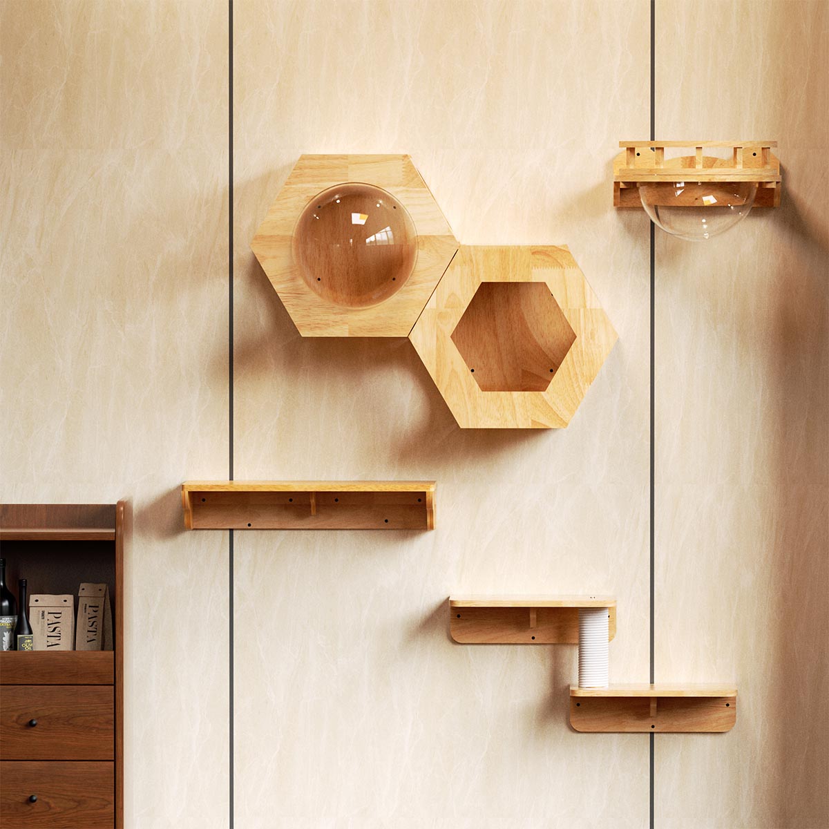 Wall Mounted Hexagon Cat Shelf Set | Rubber Wood