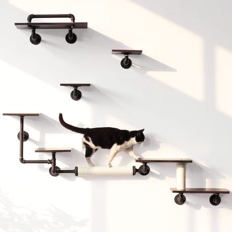 Wall-Mounted Cat Shelves (10PCS) | Smoky Wood & Aluminum Design