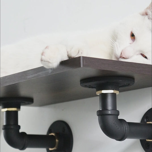 Elevate your cat's perch with the Smoky Rubberwood Perch, a stylish and functional addition to your home. This wall-mounted shelf is crafted from premium smoked rubberwood and supported by robust black industrial piping, providing a secure and elevated platform for your cat to lounge, play, or oversee their surroundings.