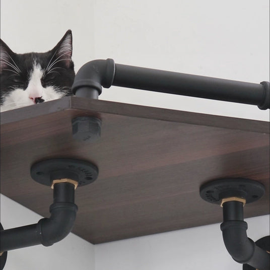 Maximize your space with the Corner Shelf Rubberwood Smoked, an ingeniously designed perch that fits snugly into any corner. Crafted from durable smoked rubberwood and complemented with sturdy black industrial piping, this shelf offers a stylish and secure elevated retreat for your cat, perfect for lounging or keeping an eye on their kingdom from above.