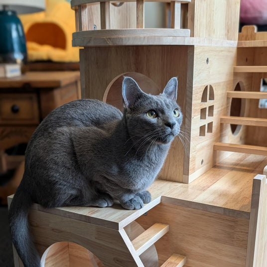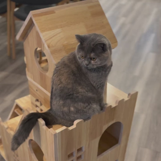 The Petomg Creative Cat Castle is handcrafted from premium rubberwood, blending a European fairy tale design with a multi-level structure for climbing, jumping, and exploring. With stairs, balconies, windows, and cozy hideouts, it satisfies your cat’s curiosity and sense of security.