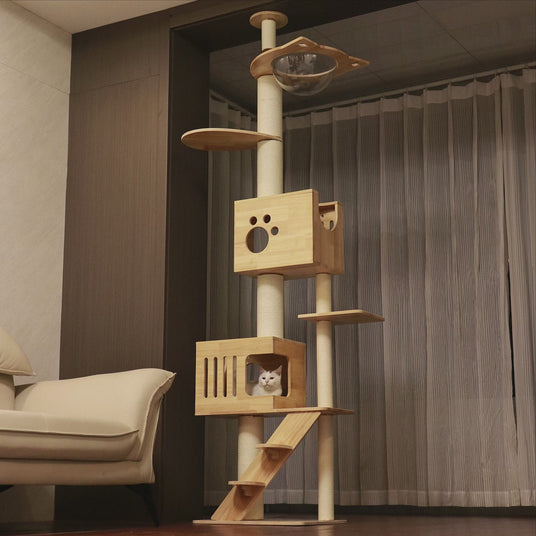 Our rubber wood cat trees are designed with both durability and aesthetics in mind, ensuring a long-lasting and visually appealing addition to your home. The floor to ceiling design provides stability and security for your feline companion, while also maximizing vertical space utilization.