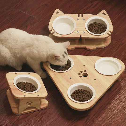 【High-quality Materials】- The base is made of natural rubber wood, which is small and novel, eco-friendly, odorless and chemical free. The bowls are food-grade ceramics, effectively preventing black chin of cats and bacterial growth.