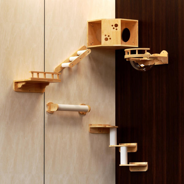 Presentamos el juego de estantes para gatos montados en la pared, el espacio vertical perfecto para tus amigos felinos. Elaborado con madera de caucho natural y respetuosa con el medio ambiente, este juego de pared para gatos ofrece un estilo de hogar versátil que combinará perfectamente con cualquier decoración interior.