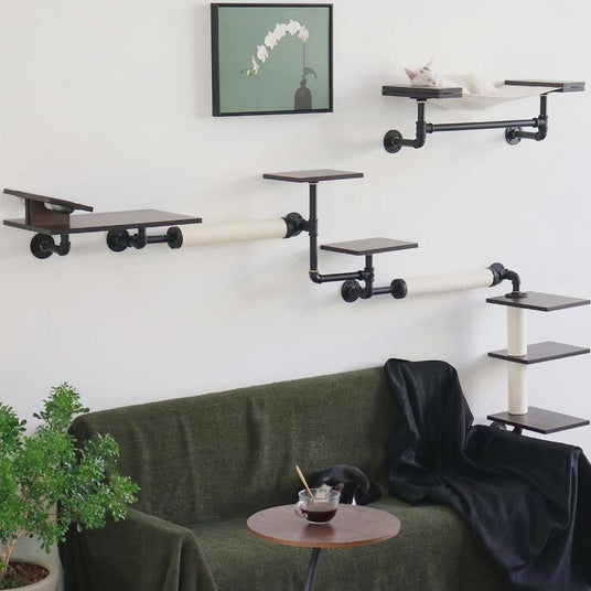 Give your cat a unique climbing experience! The PetOMG wall-mounted cat shelves feature a modern industrial design with smoked rubberwood, combining aesthetics and durability. Its sturdy pipe structure ensures stability and safety. The sisal-wrapped climbing area allows cats to scratch and climb freely, satisfying their natural instincts while saving valuable floor space. Ideal for both single and multiple cats, this cat shelf is perfect for home decor and feline entertainment.