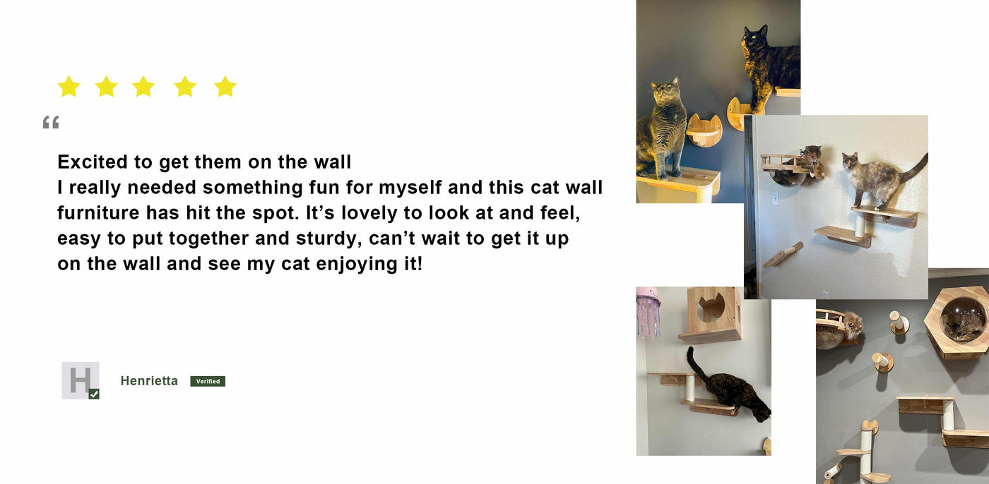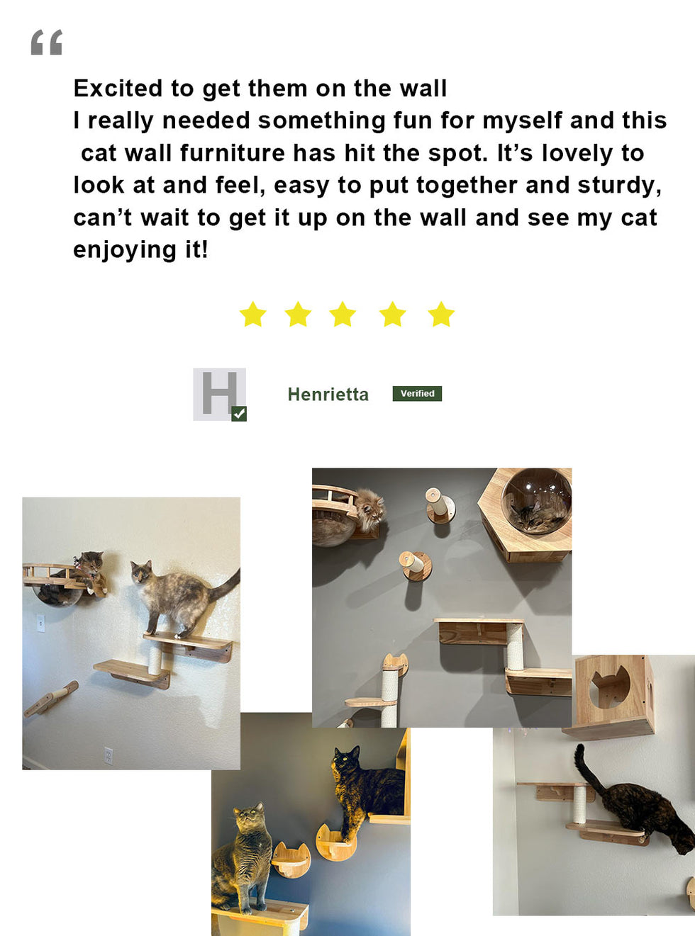 We have 3 cats, each weighing over 15 pounds, and they absolutely love this wall-mounted cat furniture especially the hammock! It’s their favorite spot to relax and look out the window. The wood looks beautiful and blends perfectly with our home décor, which was a big plus. Installation wasn’t super easy you need some basic tool knowledge because it’s kind of like a Lego set for adults but we managed, and now everything feels very sturdy and safe. Great quality and totally worth it if you want to give your cats vertical space and enrichment. -