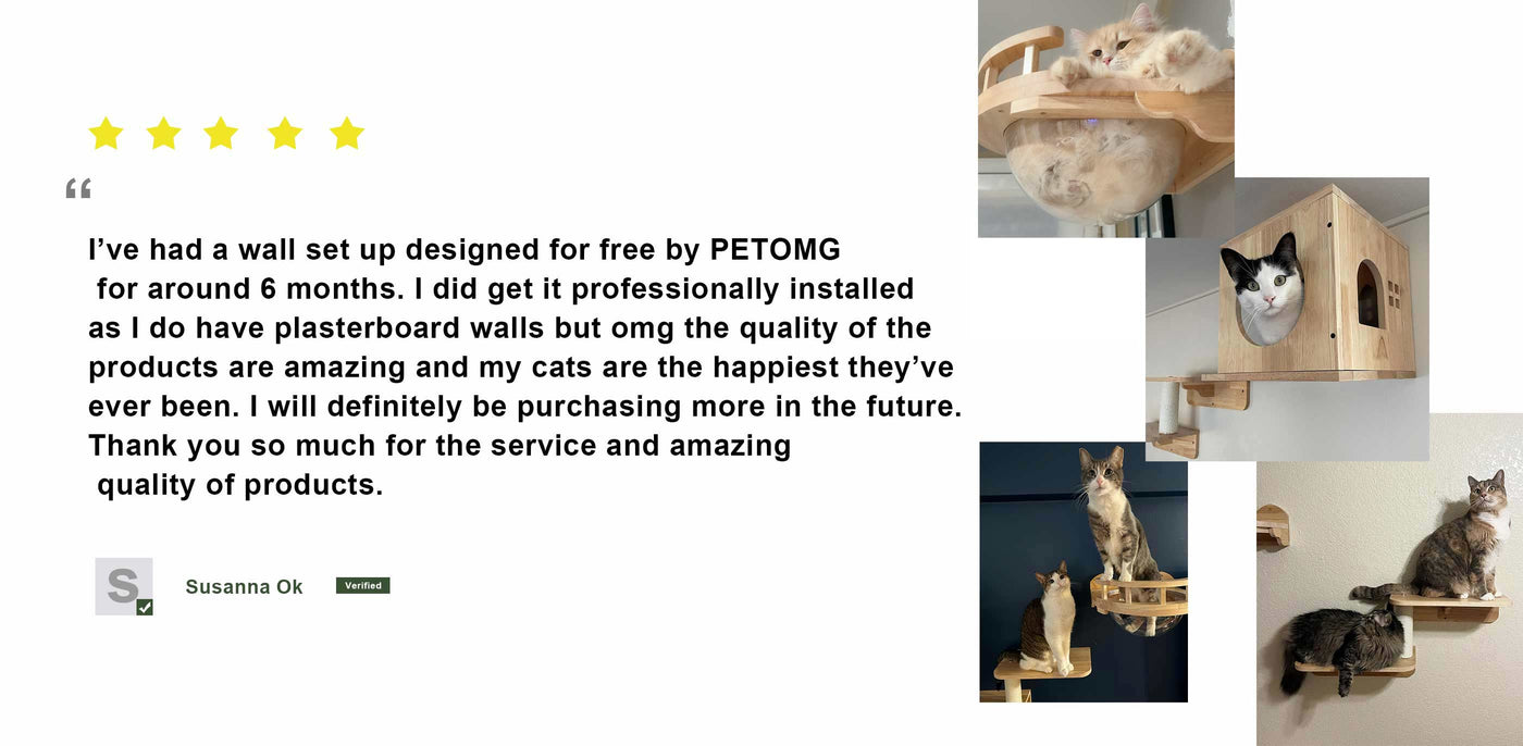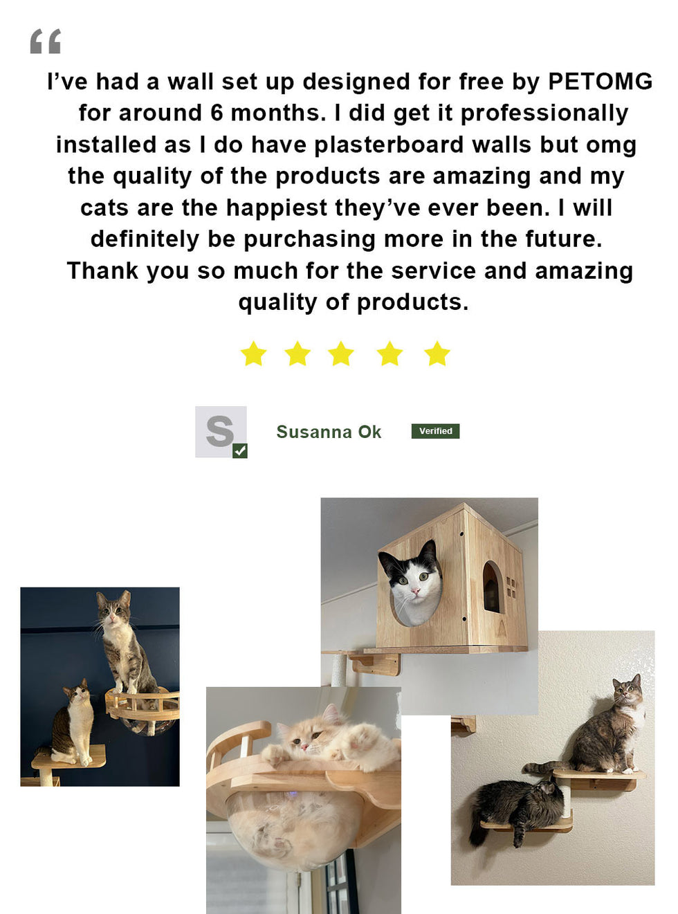 We have 3 cats, each weighing over 15 pounds, and they absolutely love this wall-mounted cat furniture especially the hammock! It’s their favorite spot to relax and look out the window. The wood looks beautiful and blends perfectly with our home décor, which was a big plus. Installation wasn’t super easy you need some basic tool knowledge because it’s kind of like a Lego set for adults but we managed, and now everything feels very sturdy and safe. Great quality and totally worth it if you want to give your cats vertical space and enrichment. -