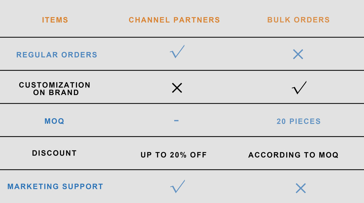 Channel Partners Program encourages relative players in the value chain to join us to promote our unique brand “PETOMG” with continuous efforts, adding value to its visual voice globally. Bulk orders are occasional cases that improve the margin per unit sold, which usually requires customization but do not have steady demand.