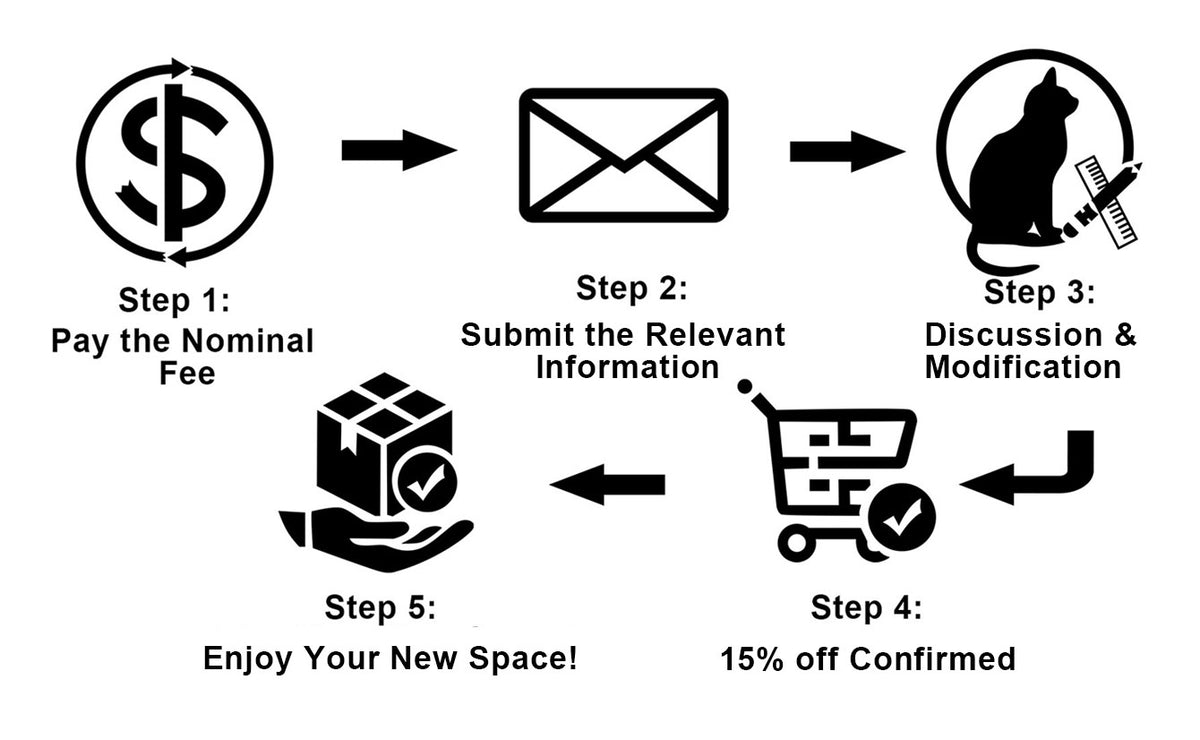 Prepare the relevant basic information required for the design service (photos of the designable area, length and width of the design area, budget, number of cats, weight, hobbies, etc,.). Please email us the relevant information separately (email at: support@petomg.com ), you don't have to order anything yet.
